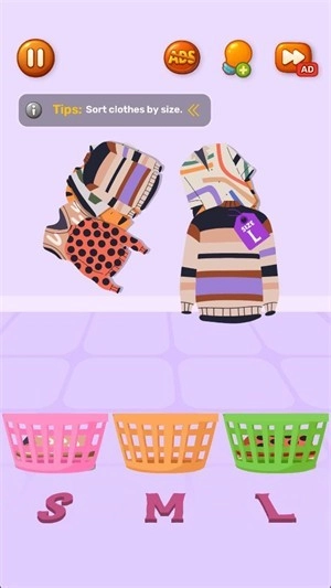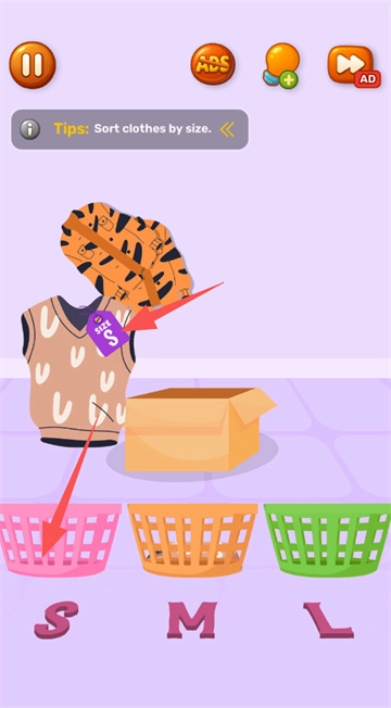1.点击衣篓会弹出衣服,点击弹出的衣服后会显示码数,需将不同码数的衣服放入对应的篮子中。