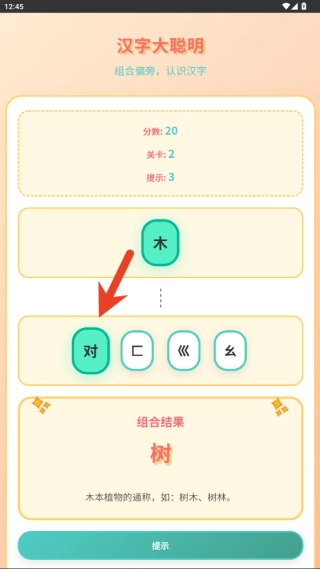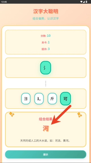 当玩家觉得自己已把偏旁部首正确拼成目标汉字时,点击提交按钮,系统会马上做出判断,要是组合正确就能通关,还会有积极的反馈。