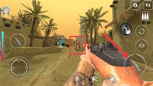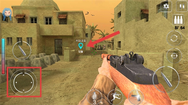 推开敌方士兵后,对准敌方士兵,按下射击按钮将其消灭,与此同时持续朝着目标位置前进。
