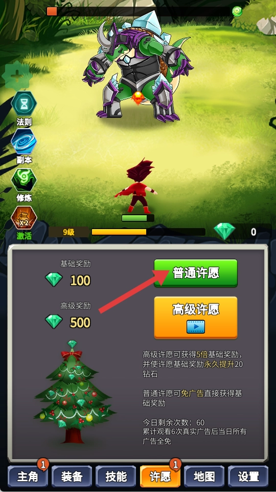 点击【普通许愿】按钮,就能领取钻石奖励,把这些资源攒起来,就可以用来给装备和技能升级啦。