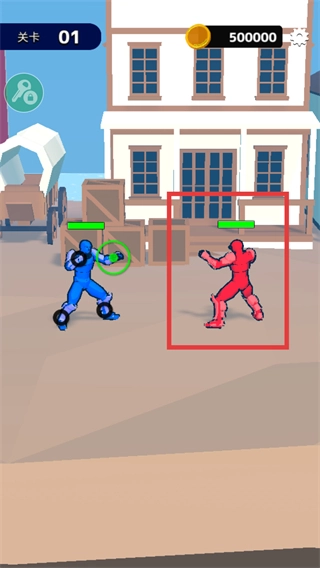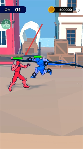 在【关卡-01】里,你需要操控蓝色角色对准红色角色,通过绘制线条来发起攻击,以此消耗红色角色头顶的绿色血条。