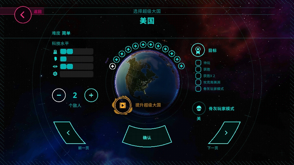 3个选项及通关难度:美国(简单),西欧(中),朝鲜(逆天)。版图越少,生命力越低。而且每个选项导弹的体系建立程度也不一样(朝鲜基本是零,三胖。。。。),所以难度不同。美国赢两次出俄罗斯,俄罗斯赢两次出中国,西欧赢两次出印度,印度赢两次出伊朗,朝鲜赢两次出以色列。朝鲜占领澳大利亚出澳大利亚,美国占领南美出巴西,西欧占领非洲出南非