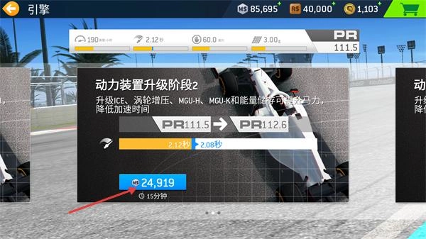 在引擎升级界面选择【动力装置升级阶段2】,花费【€24,919】来启动升级,以此缩短研发所需的时间。