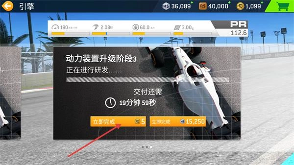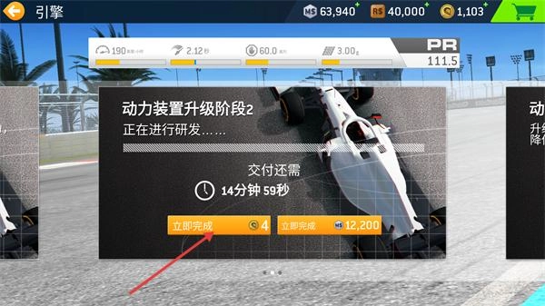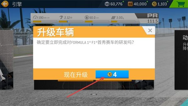 当弹出确认框后,点击【现在升级】按钮,消耗相应道具即可立即完成【FORMULA1-F1·首秀赛车】的研发进程。