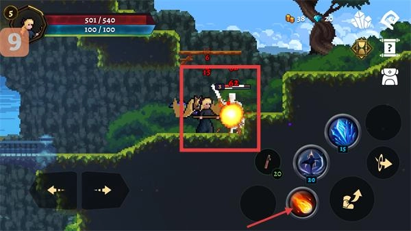 操控角色和【持斧敌人】进行战斗,点击【火焰】技能按钮发动攻击,注意自身【501/540】的血量,持续输出直至击败敌人。