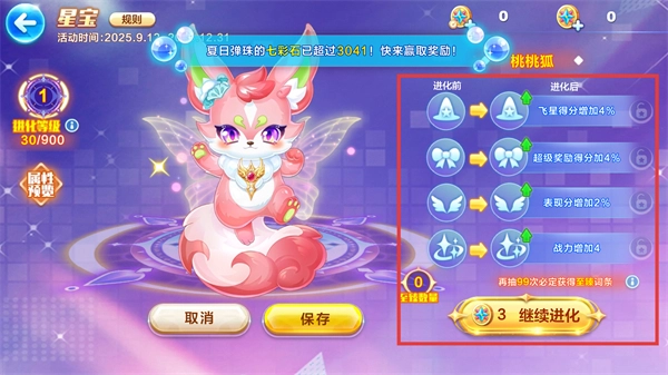 进化后的星宝属性有所提升,这里会展示进化前后的属性对比,消耗3个进化币就能继续进化,再抽取99次即可获得至臻词条。