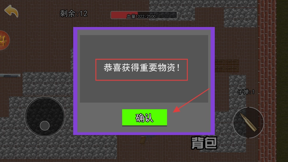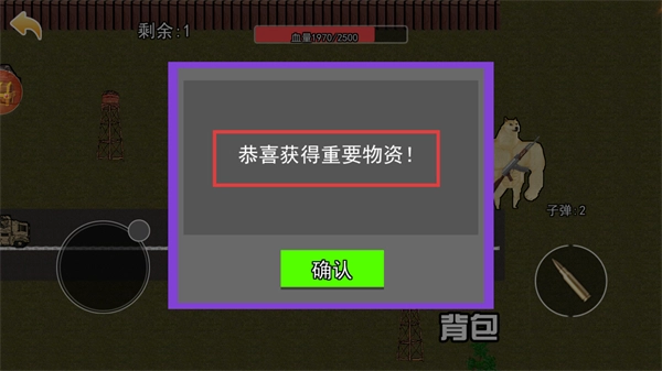 获取重要物资后会弹出提示,点击【确认】按钮关闭提示框,然后继续在场景中探索以收集更多资源。