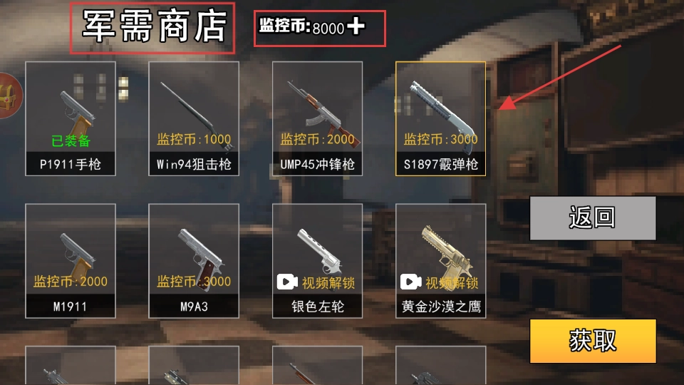在【军需商店】消耗【监控币-8000+】兑换【S1897霰弹枪】,可增强射击输出能力,为后续战斗提供助力。