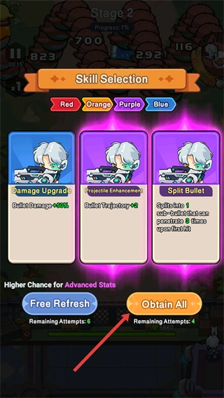 在进行技能选择时,点击【ObtainAll】按钮即可获取全部技能;建议优先选择【DamageUpgrade】,以此提升子弹伤害,增强整体输出能力。