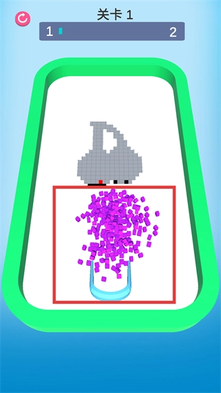 紫色方块堆不断下落,你需要滑动方框里的【铲子】,把它填充到对应的容器中,这样就能完成基础形状的拼接,进而推动关卡向前进展。