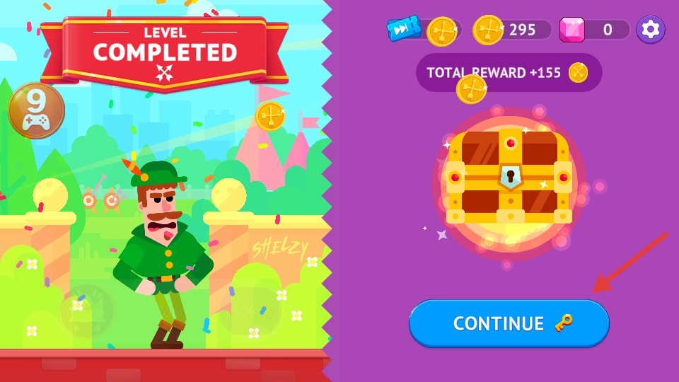 战胜对手后,能得到金币、宝箱之类的奖励,点击【CONTINUE】按钮就可以进入下一关。