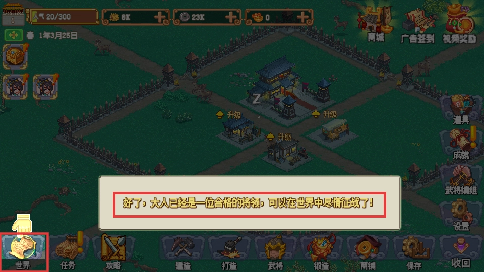 点击【世界】按钮开启征战之旅,凭借前期积累的建设成果,在动荡的乱世中一边冒险一边发展,主动发起征战以不断壮大自身势力。