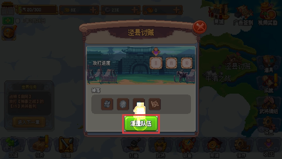 进入【泾县讨贼】界面,点击【派遣队伍】进行讨伐,以此获取资源,助力关卡推进与势力发展。