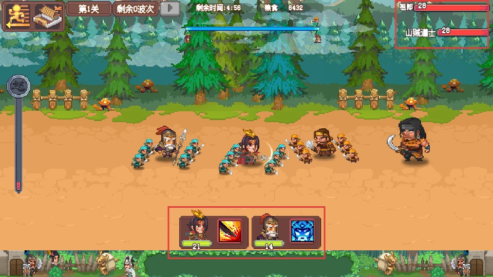 战斗时留意武将【21】【14】的血量,看准时机释放技能,击败【祖郎-28】【山贼道士-26】以确保胜利。