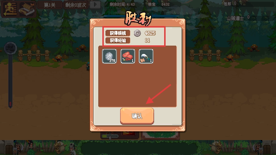 战斗获胜后,可查看获得的【4625】铜钱、【11】点经验等奖励,点击【确认】按钮领取,积累资源以便后续再战。