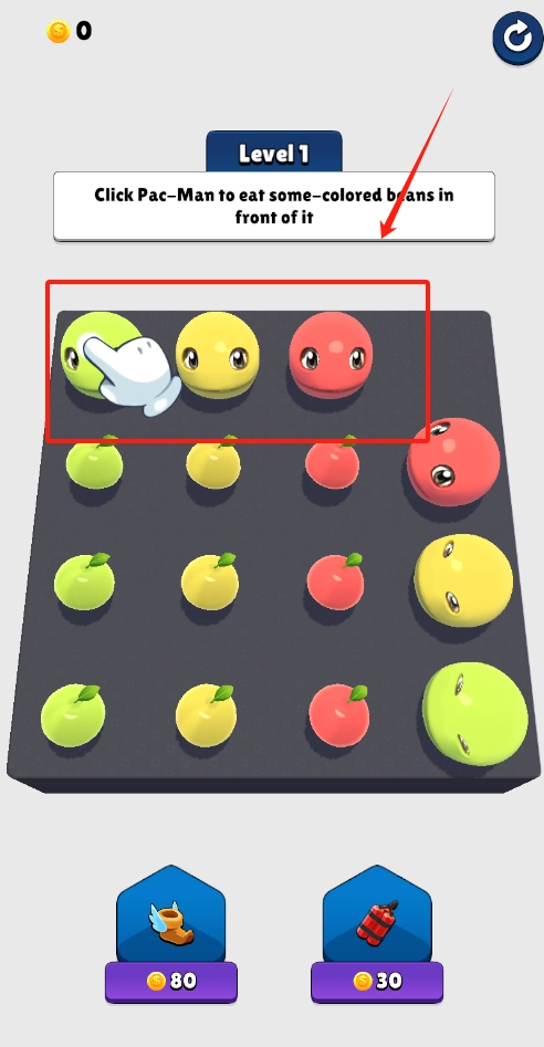 2、瞅见屏幕上方显示Level 1和带手的吃豆人,点吃豆人角色让它去吃前方同颜色的表情豆子得分哟。