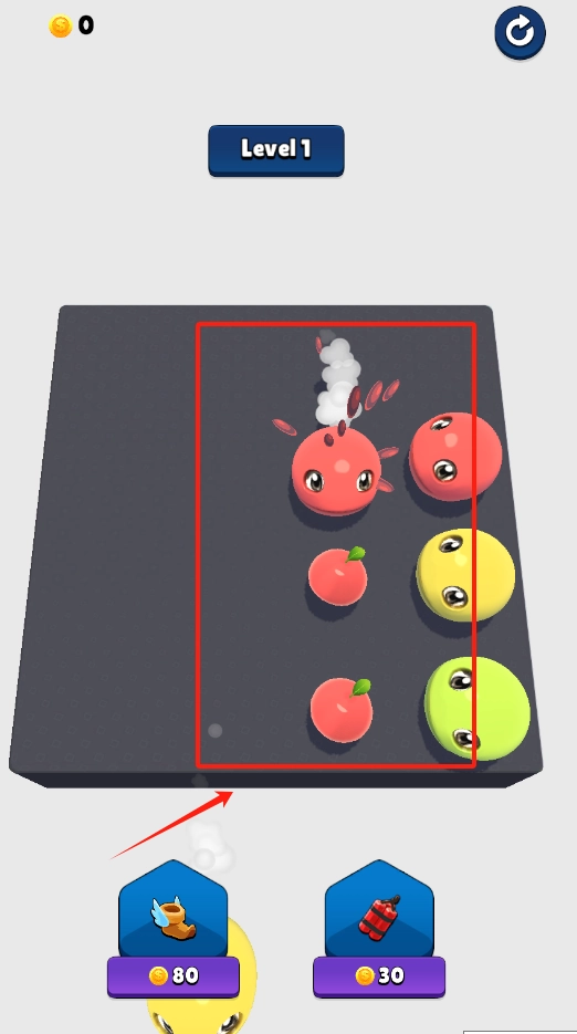 3、瞧见灰色背景上Level 1和黑色平台上的彩色球体,点下方黄色或红色道具图标就能使用它们清除球体啦。