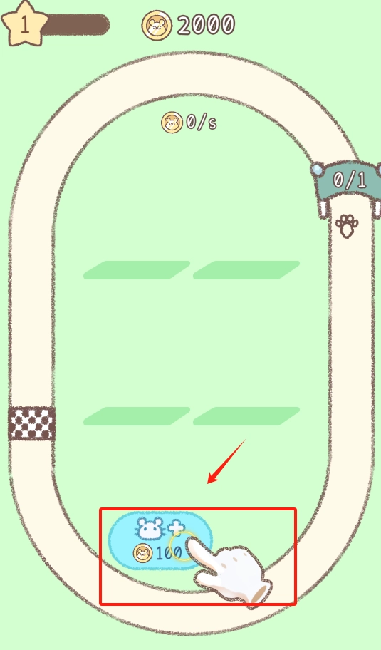 2、看环形跑道上仓鼠跑动,收集金币,点蓝色加号图标获取更多资源。