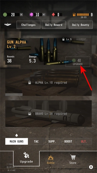 在武器升级界面点击UPGRADE按钮是强化武器性能的核心操作,消耗资源后能提升武器的伤害、属性以及战场作战效率。