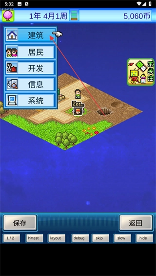 点击右下角的菜单按钮,进入菜单列表后,选择“建筑”选项,为居民创建住所。