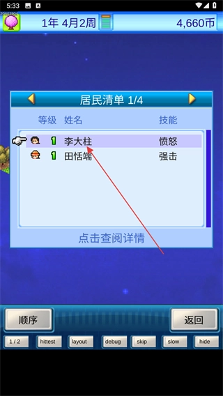 点击岛屿上的居民,能够查看居民的技能等级;点击信息栏里的姓名,则可以查阅详细情况。