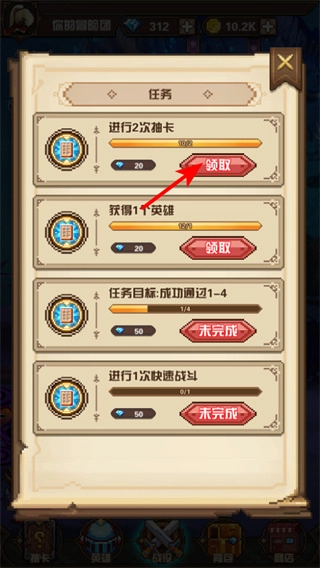 在游戏里点击任务按钮就能看到任务列表,完成任务后点击领取按钮,就能获得钻石、金币之类的奖励,通过积累这些资源可以帮助冒险团更好地发展。