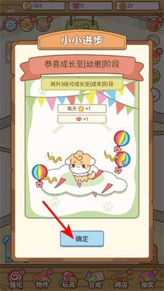当宠物成长到幼崽阶段,点击确定按钮就能确认其成长进度;宠物每提升3级,即可进入成年阶段,并获得爱心奖励。