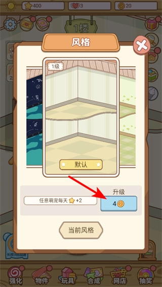 在风格界面点击升级按钮,能够提升风格等级,这样一来,任意萌宠每天都能获取更多的金币收益,从而为店铺发展提供助力。
