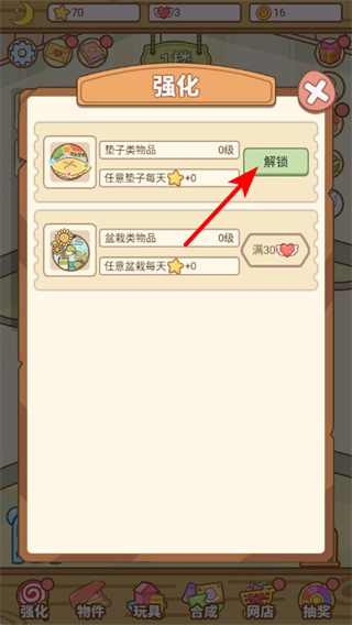 点击解锁按钮即可开启垫子类物品的强化功能,强化后任意垫子每日都能产出金币,这些金币可用于积累解锁更多强化项目。