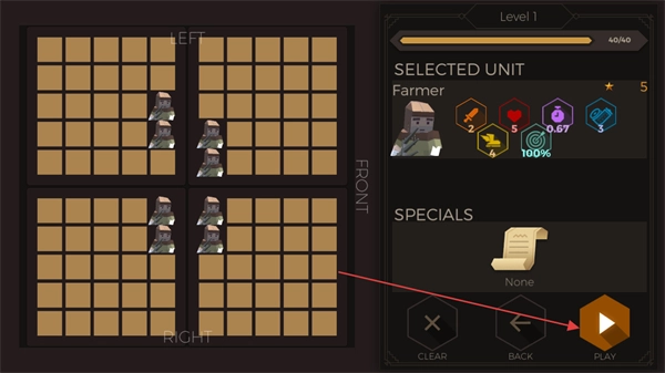 在布局界面挑选Farmer这类单位,摆放妥当后点击PLAY按钮就能开启战斗。