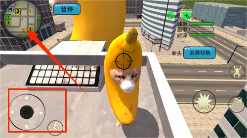 3、屏幕左上角区域显示缩略地图导航,底部排列着方向控制与功能按键,方便随时进行移动操作。