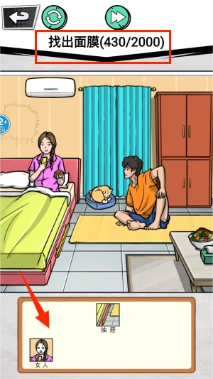 3、认真查看卧室的全景图,点击找出散落在各个地方的面膜产品。