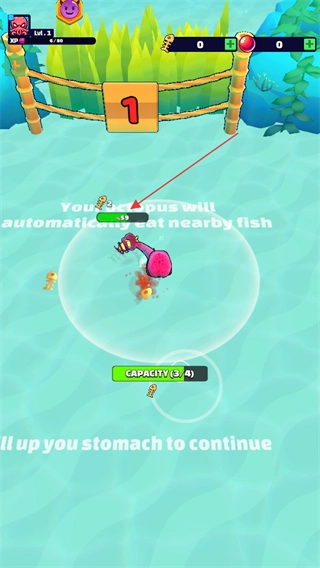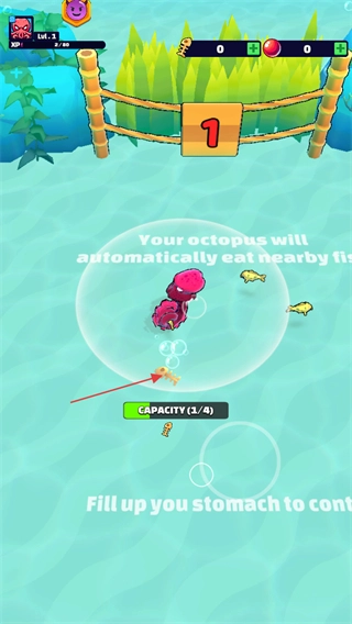 操控章鱼引诱其他小鱼游入触手的活动范围,然后将其吞噬;被捕获的小鱼上方会显示吞噬后得到的鱼骨数量和恢复的血量。