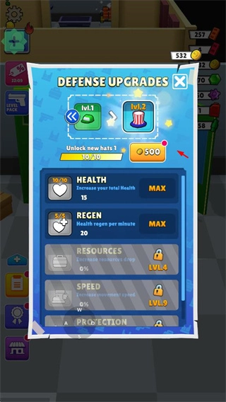 消耗资源来升级防御属性,以此增强角色的生存能力,与此同时还能解锁全新的外观。