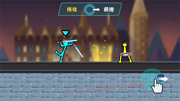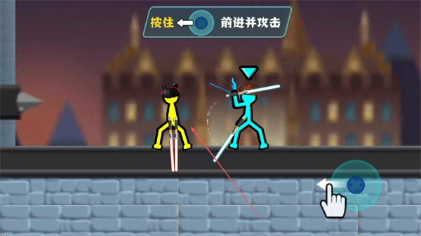 你可以按住右侧的方向按钮来操控火柴人向前移动,以此靠近敌方火柴人。