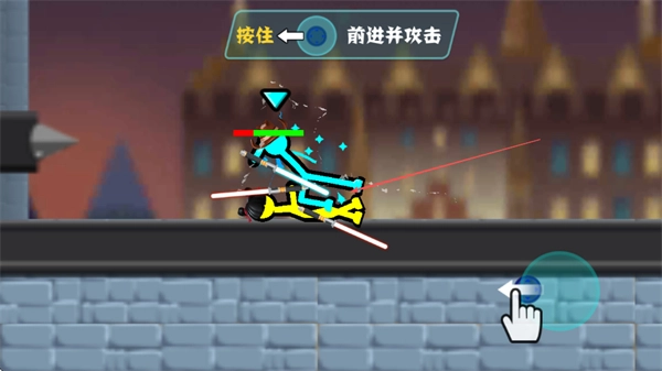 按住左侧方向按钮,能使火柴人向前移动并发动攻击,和敌方进行近距离战斗。