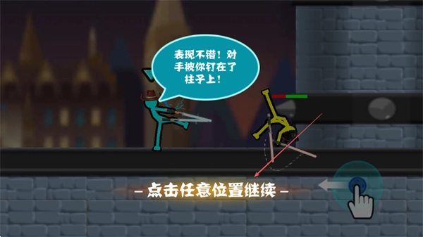 在击败敌方火柴人之后,点击屏幕上的任意一处位置,即可继续推进游戏进程,去挑战下一位对手。