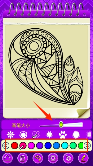 3、接下来会出现待涂色的图案,下方配有各色颜料盘,你只需用画笔为图案填色就行,另外拖动画笔对应的进度条还能调整画笔的粗细呢。