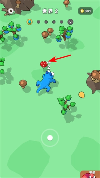 进入世界2后,操控蓝色生物吞噬棕色蘑菇,吞噬后可获得进化经验,推动生物成长进化,注意观察蘑菇分布高效收集。