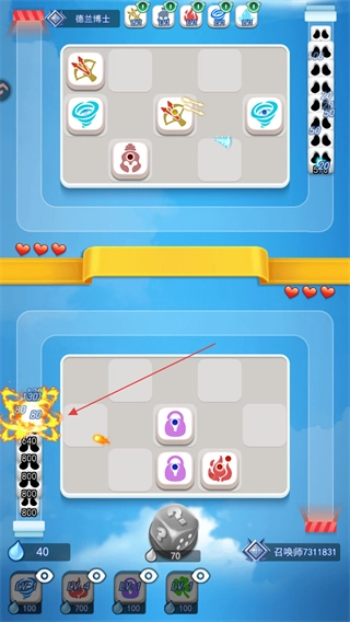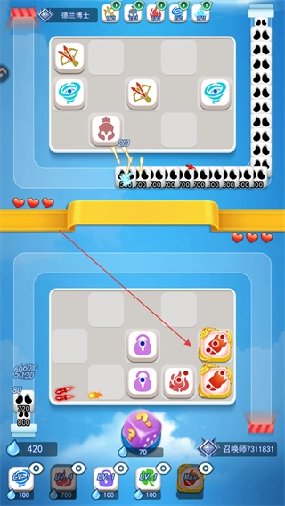可以通过合并升级自身的火焰等元素,利用它们攻击敌方所在的格子,以此来减少敌方的血量。
