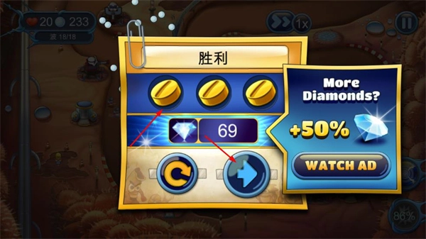 成功抵挡完所有波次的敌人后,就能得到金币、钻石这类奖励,另外也能借助观看广告来获取更多钻石。