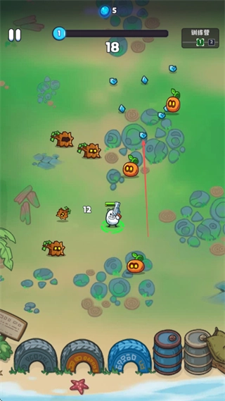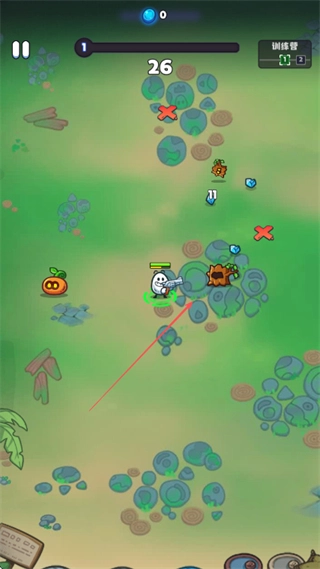 操控茶叶蛋角色去攻击橙色和棕色的怪物,收集蓝色宝石,以此来提升关卡进度。