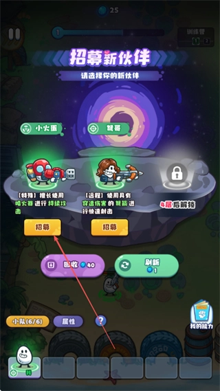 点击招募按钮,挑选像小火箭这样的新伙伴,提升战斗能力。
