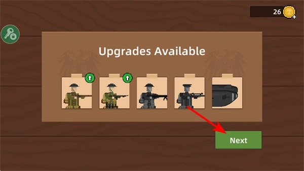 点击Next按钮就能查看升级选项,升级操作是增强士兵战斗力的关键环节,挑选恰当的升级方案能够提升军队的攻击能力。