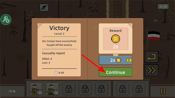 关卡获胜后点击Continue按钮就能继续游戏进程,继续推进即可开启下一关的挑战,需要持续增强军队的战斗力来应对难度更高的战斗。