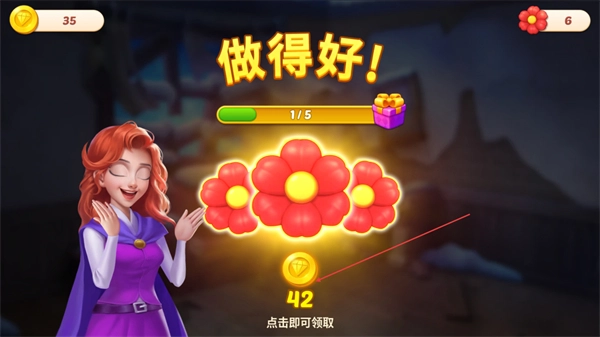 4、通关后点击奖励区域,领取金币与花朵奖励,完成关卡流程。