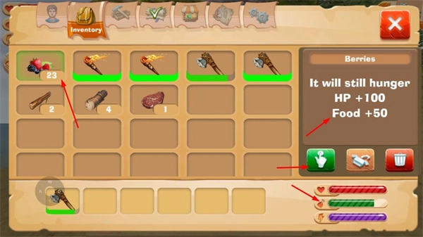 食用浆果可以恢复生命值与饱腹感,帮助维持生存状态,为后续的持续探索打下基础。