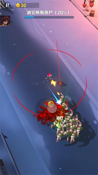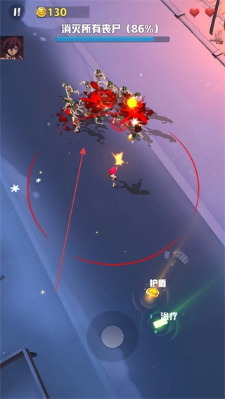 不断攻击丧尸,留意收集护盾、治疗等道具,直到把所有丧尸都消灭掉,完成这一关卡。