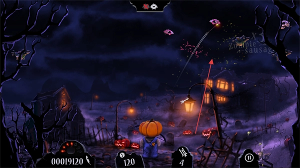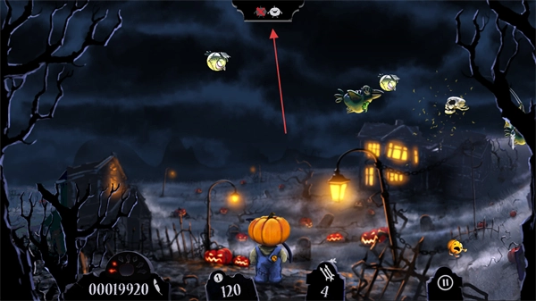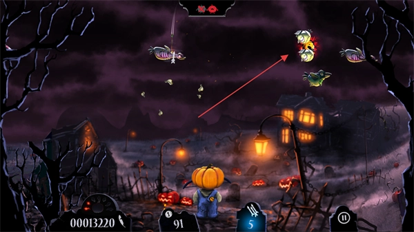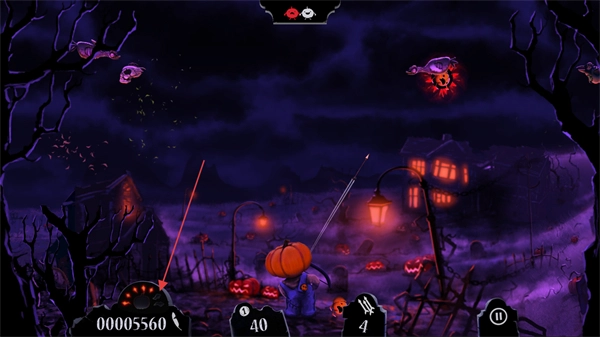 你将操控南瓜头角色,瞄准空中的僵尸鸟、骷髅等敌人发射武器,击中即可得分。