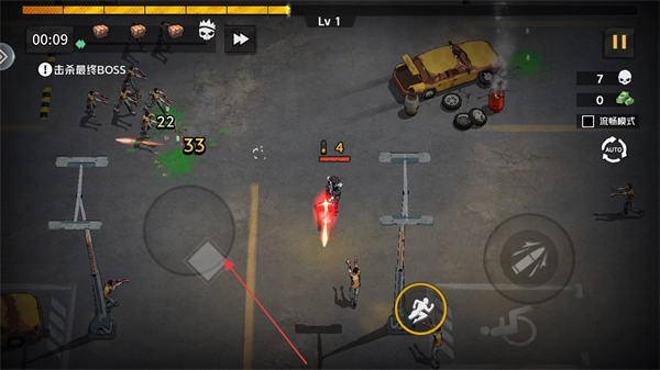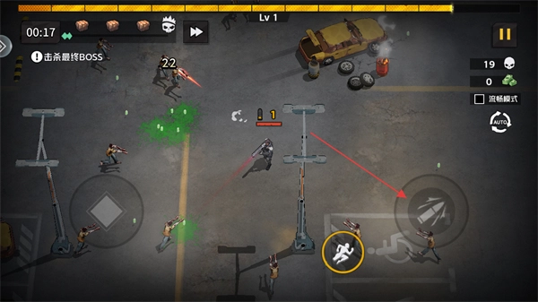 进入游戏后,先确认当前等级是Lv1,以及关卡目标是击败最终BOSS,之后通过左下方的虚拟摇杆来控制角色移动和调整位置。